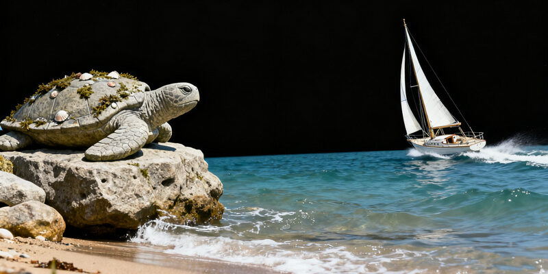 岸边住着一只年迈的石龟和一只好动的小帆。石龟日夜守望潮汐,背上常覆着海藻与贝壳,稳稳卧于礁石上;小帆渴望远航,总嘲笑石龟不知何为冒险,常在晴日里夸耀自己的速度。